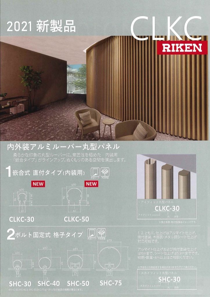 RIKEN 新商品のご紹介(幕板・パネル、アルミパネル) 2021年10月28日 最終更新日時 : 2023年8月31日 fujinishi01 RIKEN 新商品のご案内 内外装アルミルーバー丸型パネル 商品のお問合せは、弊社までご連絡下さい。